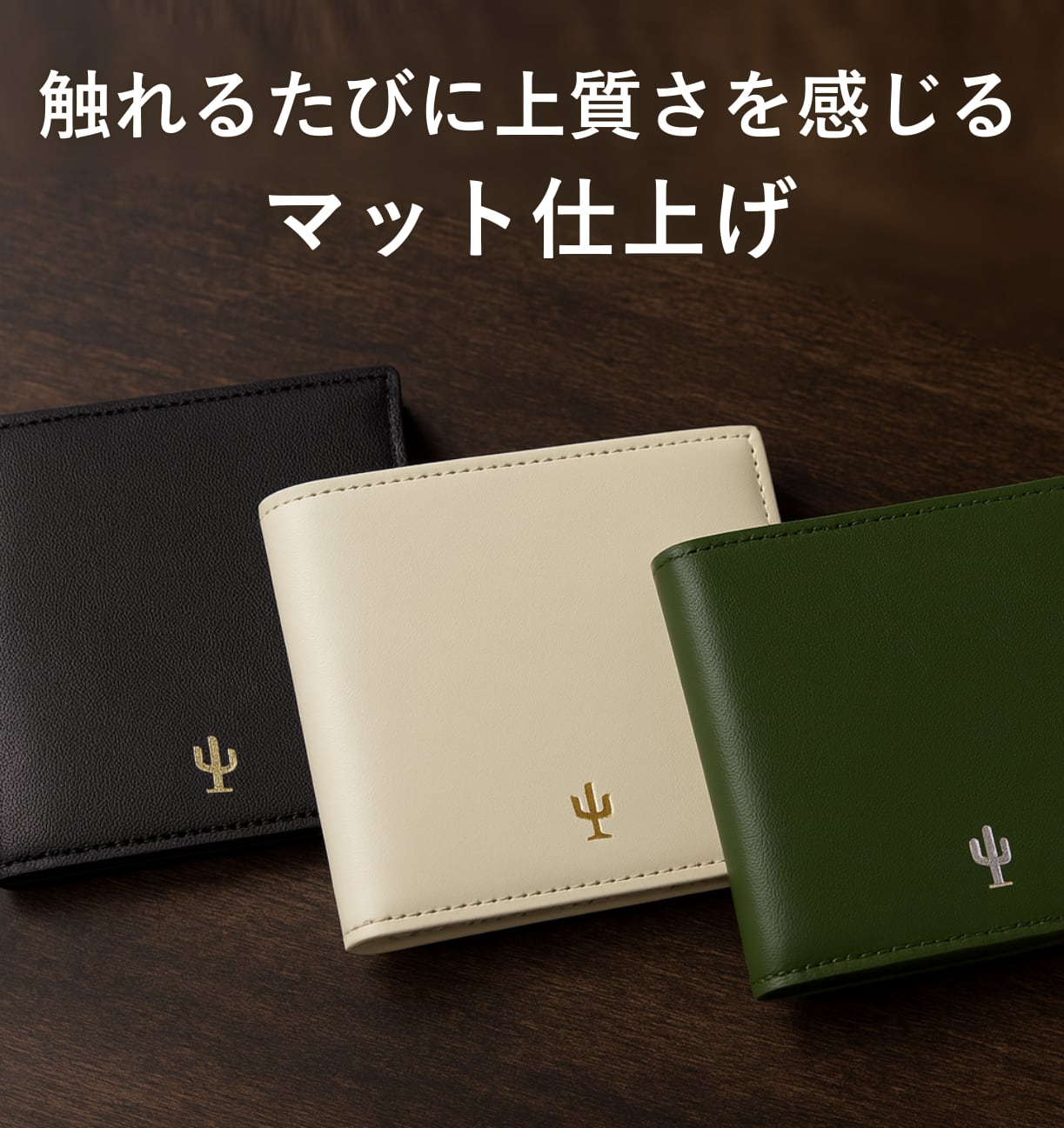 【エコな高級素材】 メキシコ産サボテン由来ヴィーガンレザー使用。本革を超えるなめらかな質感。 【超軽量200g】 驚きの軽さで、ジャケット内ポケットでもかさばらない薄型設計。 【実用性】 紙幣ポケット×1、カードスロット×4。必要なカードをスマートに収納。 ・サボテンレザーは耐摩耗性、耐水性に優れており、長く愛用いただけます。 ・世界が注目するサステナブルレザー:メキシコ『Desserto(デッセルト)』社のヴィーガンレザーを使用。水と環境負荷を極限まで抑えて生産された素材です。